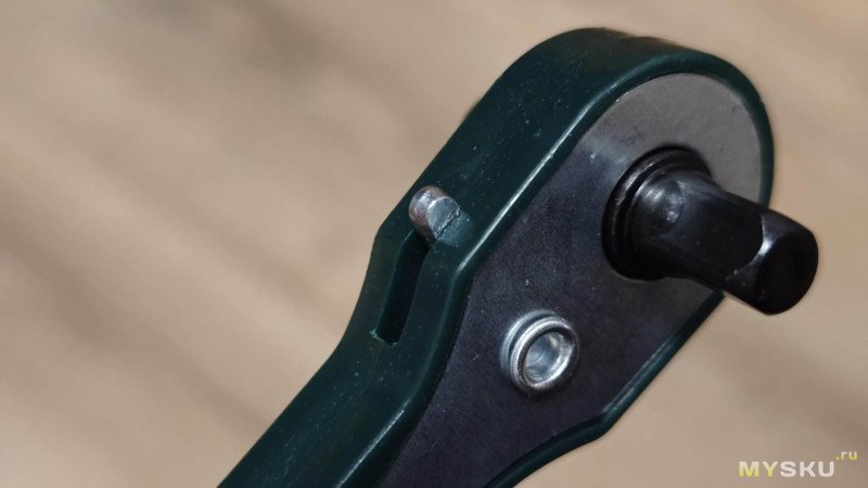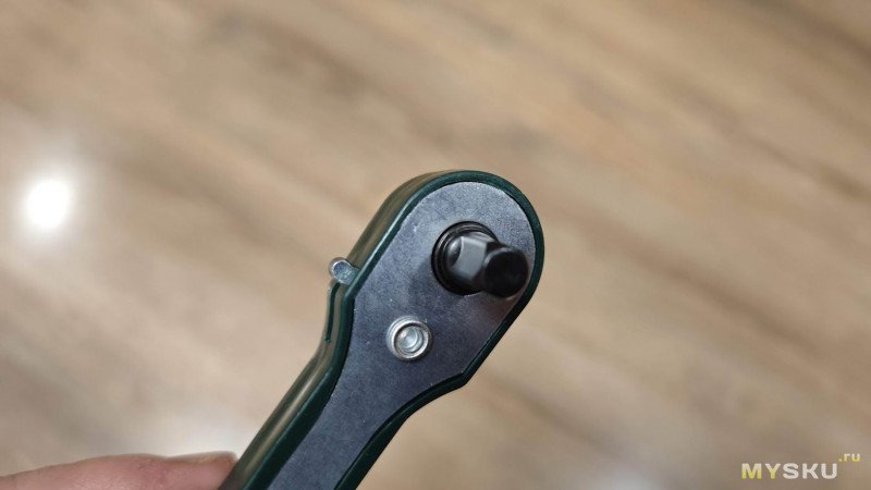 Посмотреть, что находится внутри головки ключа не позволяют заклёпки, которыми скреплён корпус инструмента, но в теории там находится зубчатое колесо (храповик) и одна или несколько подпружиненных «собачек» (фиксаторов). Когда мы перемещаем рычажок переключателя, то он физически смещает внутреннюю собачку или меняет её положение, чтобы она цеплялась за зубья храповика только при вращении в определённом направлении.