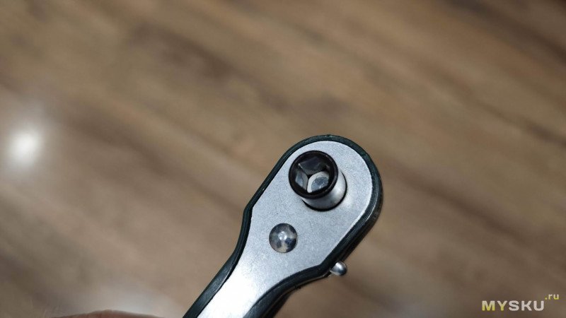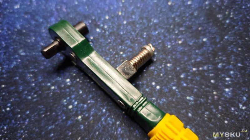 У меня есть несколько наборов различных бит с отвёртками, в том числе с храповым механизмом, в простонародье — трещоткой с реверсом, но вот такого торцевого ключа в них нет. А иногда бывает удобнее всего крутить именно таким ключом, с боковой установкой биты или головки. Поэтому взял такой ключик, чтобы дополнить им свои наборы оснасток.