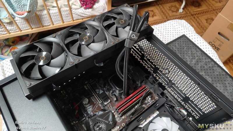 Но водянка не влезла в корпус, пришлось снять одну вертушку, перевернуть радиатор чтоб залезло.