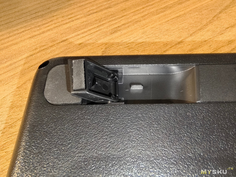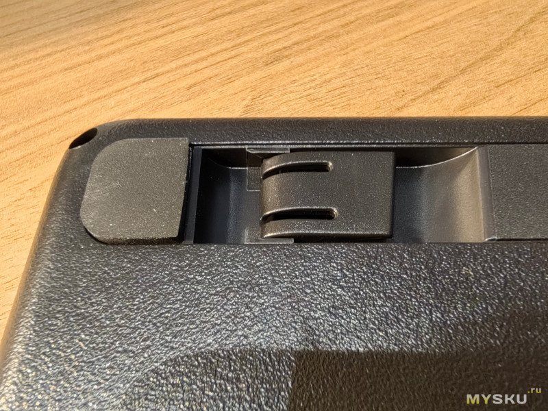 Ножки производят впечатление прочных, плотно фиксируются в обеих положениях, в откинутом положении они ложатся на края своих ниш, причём соотношение плеч получающегося рычага такое, что усилия на излом и вырыв шарнира минимальные, чувствуется тщательная инженерная проработка – именно из таких деталей складывается комфорт и надёжность. Откинутые ножки приподнимают клавиатуру на 5 мм. Крепление подставки для запястий обычное, на защёлках, имеет небольшой ход, достаточный для приподнятия кнопатуры на откидных ножках.