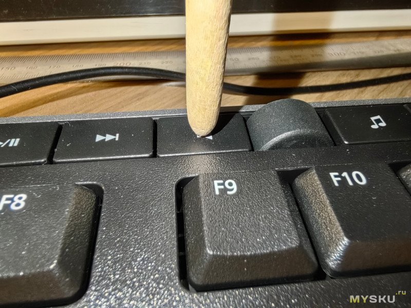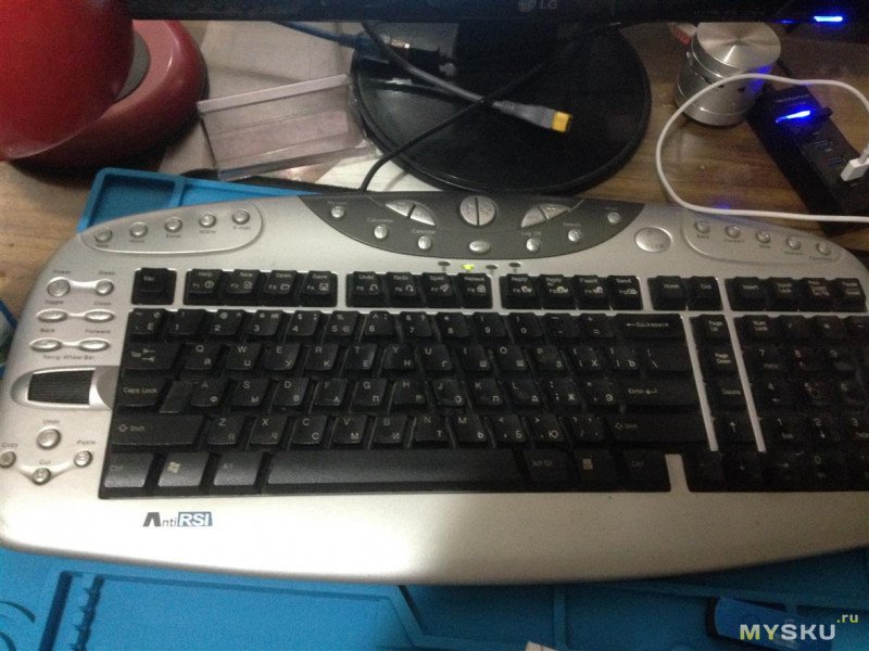 Над функциональным рядом находится ряд из 12 медиаклавиш в четырёх блоках: браузер, почтовый клиент, Из дополнительных возможностей имеется USB концентратор на два порта, ожидаемо способный выдать не более 500 мА на оба порта суммарно и пригодный даже не для всех флешек и больше рассчитанный на подключение мыши, как проводной, так и беспроводной, с ними проблем не возникает. Ну и можно заряжать маломощные устройства типа часов и наушников, требующие около 150 мА, и подключать периферию, не получающую питания по шине. И естественно, ни о каких внешних винчестерах и SSD речи не может быть, кроме накопителей с отдельным питанием, но вряд ли имеет смысл подключать их в USB 2.0. В любом случае, дополнительный USB концентратор, даже такой, не помешает, что подключить в него найдётся на любой ПЭВМ. У меня туда на постоянку подключены зарядка для часов и приёмник для «гостевой» мыши, поскольку на домашнем ПК основным устройством координатного ввода служит трекбол.