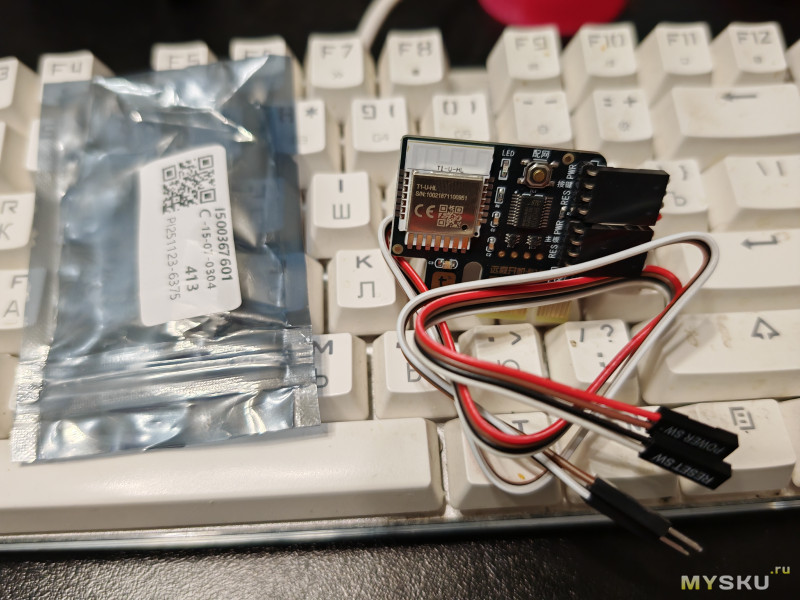 После подключения питания ПК плата мигает синим огоньком, что говорит о готовности сопряжения (рядом с индикатором есть небольшая кнопка, при её удержании произойдёт сброс настроек сети и можно будет подключать заново).