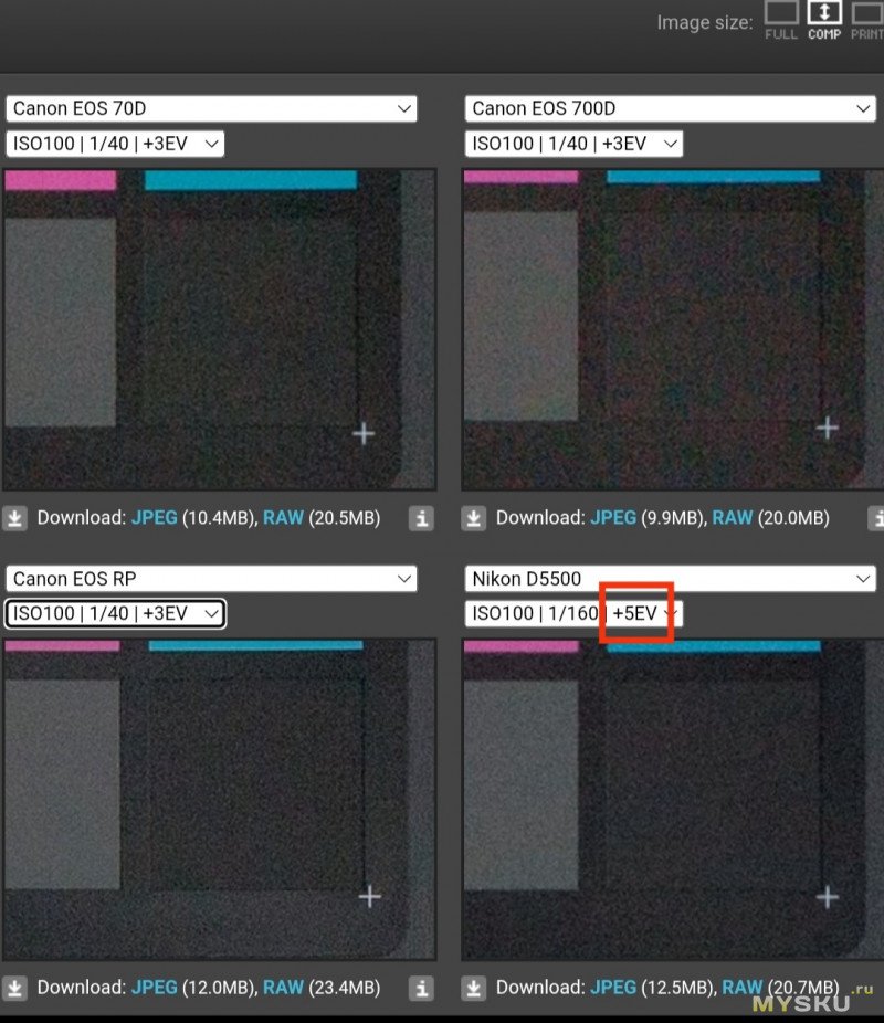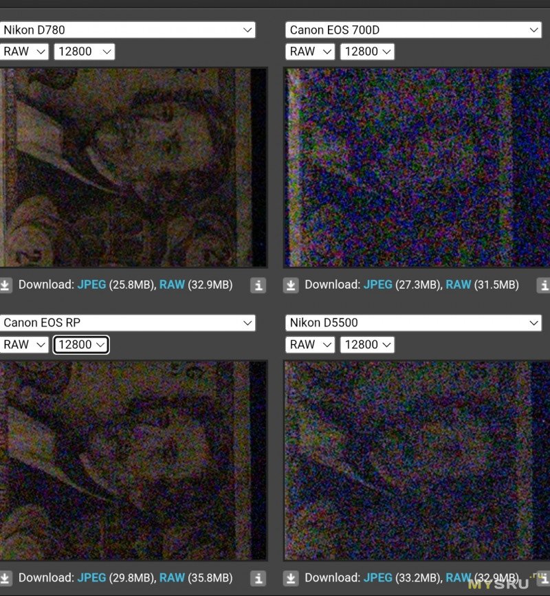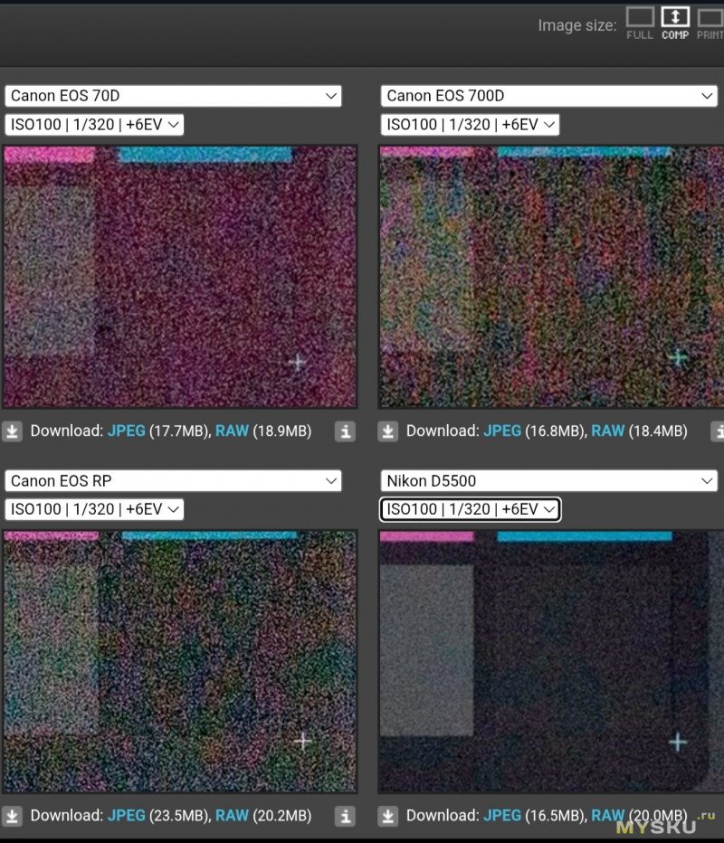 Виной тому старая матрица с высоким уровнем цифрового «шума» и слабым диапазоном яркости. Подобные отсталые матрицы только большего размера установлены в фотоаппаратах Canon 6dII и беззеркальном полнокадровом фотоаппарате Canon RP.