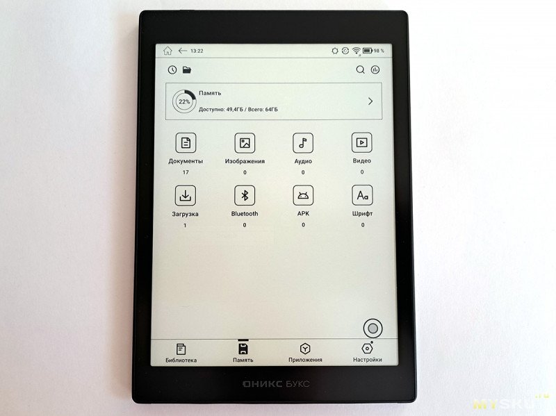 Свободно 49.4 ГБ. Если загружать книги в формате FB2, то места хватит под огромную библиотеку. А вот если комиксы, журналы и техническую литературу в отсканированном формате (pdf и др.), поместится уже поменьше наименований, но в большинстве случаев, места будет достаточно.