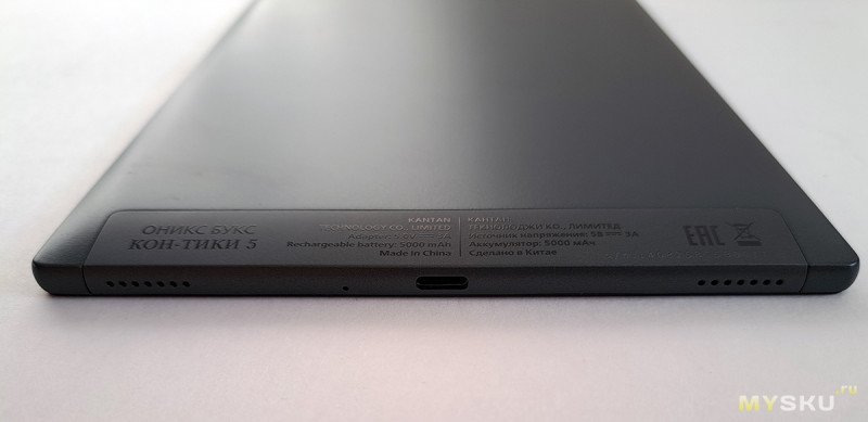 Толщина корпуса всего 7.4 мм. На нижней грани распложен разъем USB Type С и отверстия динамиков, а также микрофона.