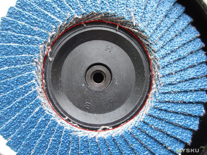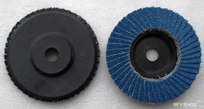 Сначала попытался вставить центрирующую проставку (полоску листового металла вокруг вала), но это слабо помогло — лепестки же наклеены криво. Далее прижал в сторону, противоположную их смещению, и вот это заметно улучшило ситуацию. Хотя конечно раз на раз все равно не приходится.Сравнить их мне не с чем, в ВИ распространены диски с резьбой, не знаю для какого вида инструмента они предназначены, один такой я купил, предполагая просверлить отверстие, но руки так и не дошли.