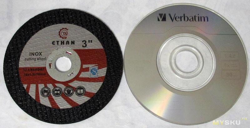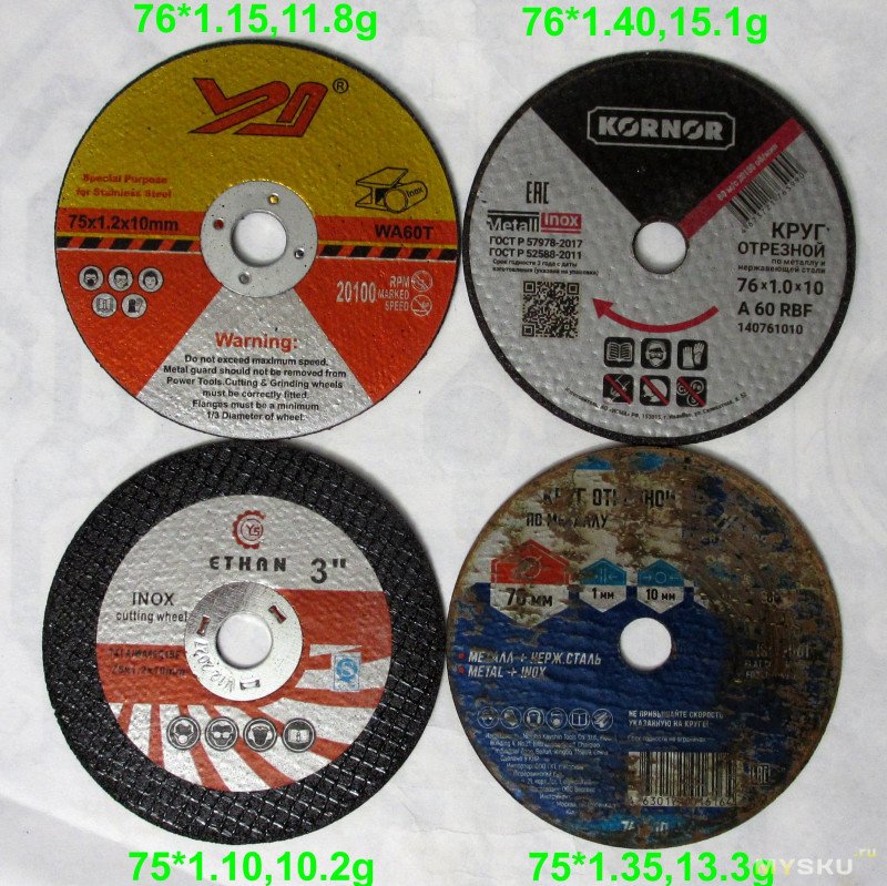Сравнил их с несколькими ранее купленными. Зато у них постоянная «болезнь» — несоответствия толщины заявленной в большую сторону, а для миниболгарки это достаточно критично, дури в ней не так много и лишняя толщина повышает нагрузку. С соответствием диаметров тоже раз на раз, но зачем их вообще существует два варианта мне непонятно, тем не менее из 4х один 75 оказался 76, а один 76 оказался 75. С другой стороны выравнены: