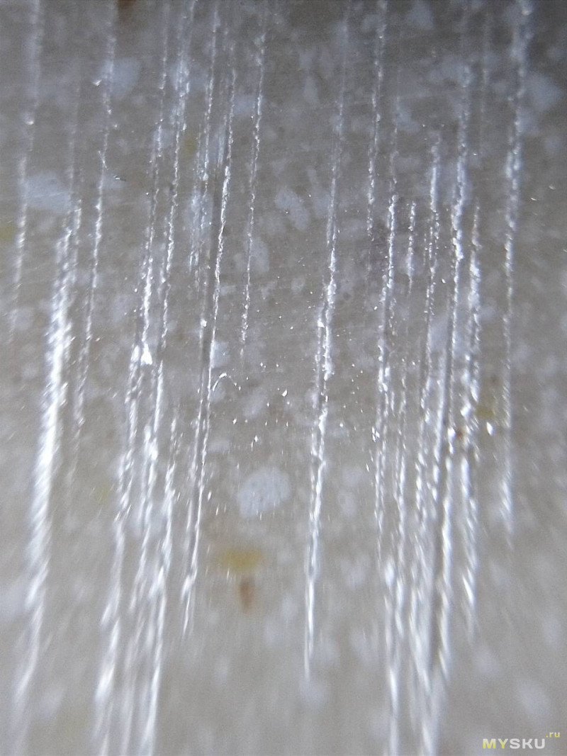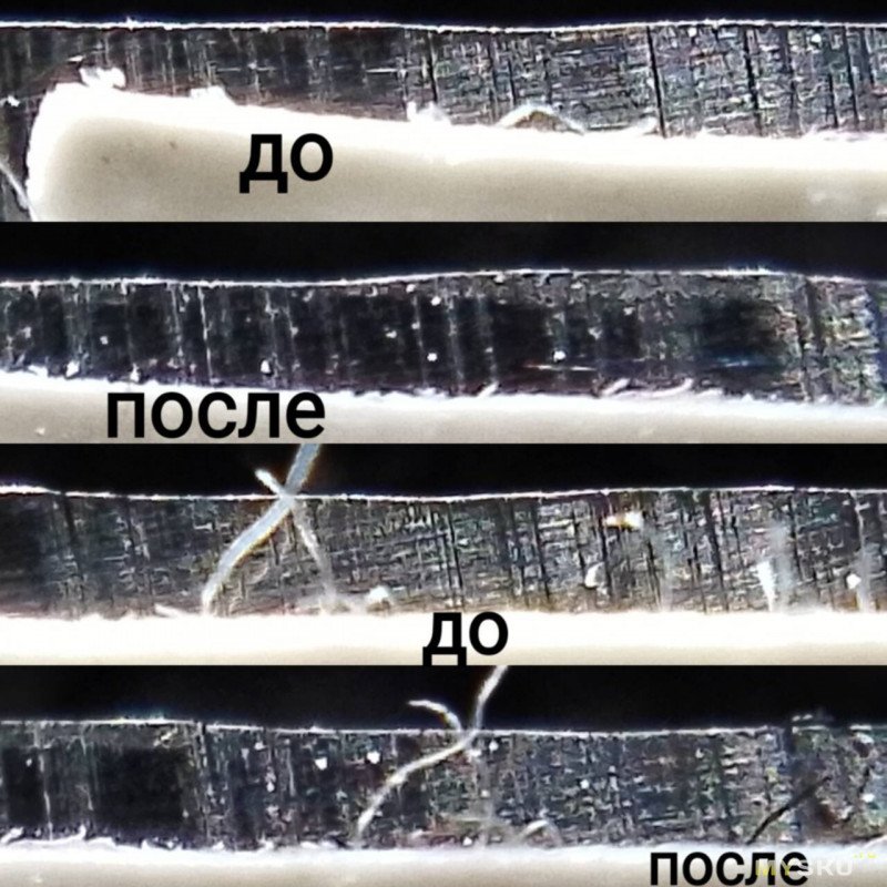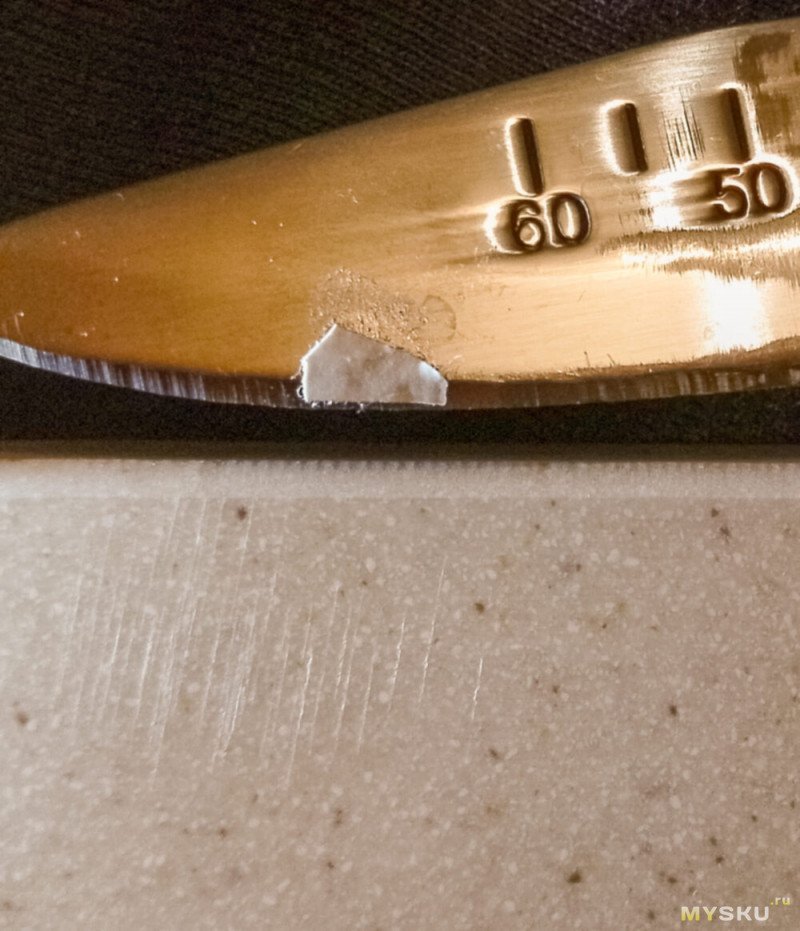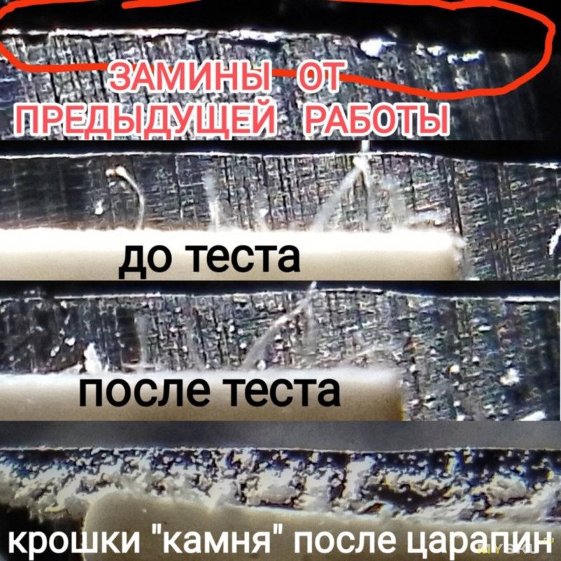 Китайский камень не оправдал моих ожиданий и оставил на ноже много крошек камня. Кромка ножа абсолютно не изменилась. Резать для ножа безопасно, а для здоровья нежелательно. Крошки «камня» попадут в еду, на сковороду, расплавятся и в желудок.