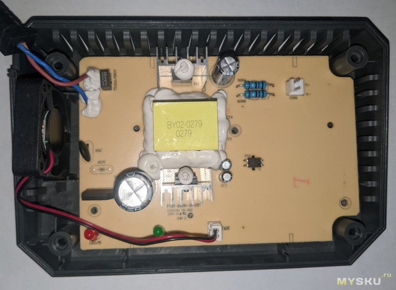 Что касается вентилятора, его реализация меня позабавила. Получается, когда напряжение меньше напряжения конца окончания заряда, он просто лупит на полную, и одновременно горит красная лампочка. А что, дешево и сердито! По сути все зарядное это просто дешевая зарядка мобильника на стероидах с регулировкой тока и вентилятором. В таком подходе есть и недостатки, о которых мы поговорим на тестировании.