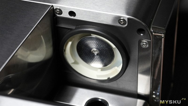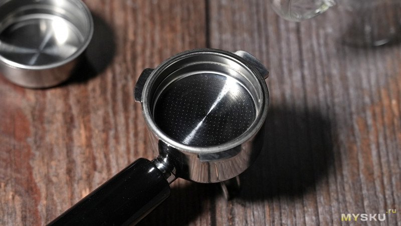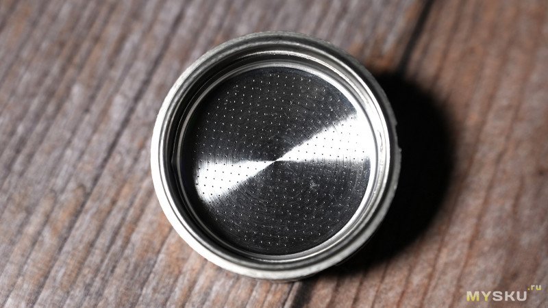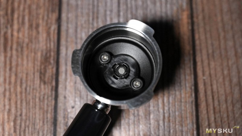 Внутри по центру пластиковая вставка с фильтрующей сеткой. При желании снимается. Внизу от сливного отверстия отходят два желоба, по которым и будет стекать кофе.