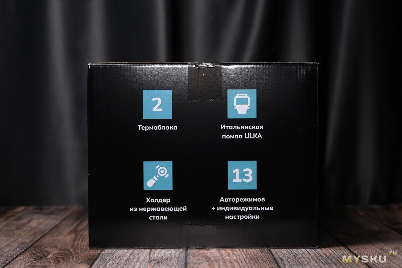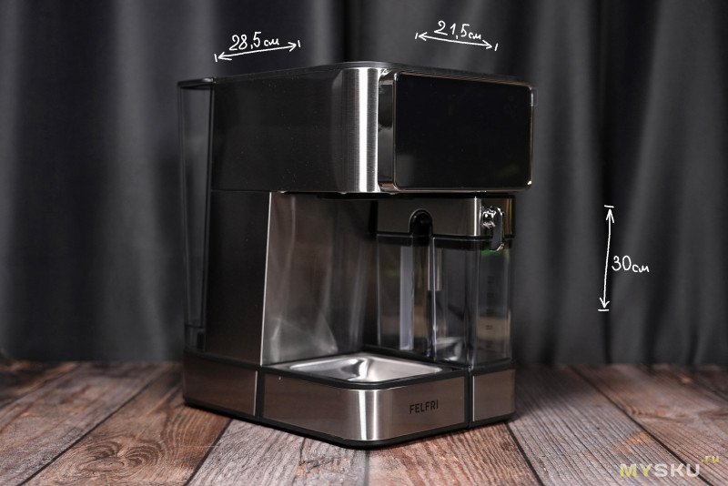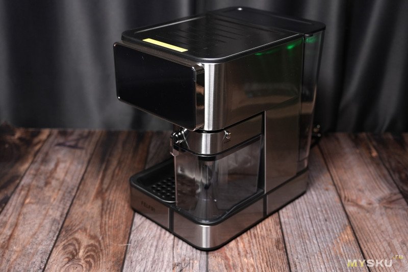 Дизайн кофеварки выполнен с уклоном в строгий угловатый стиль, внешне отдалённо напоминающий серьёзные дорогие автоматические кофемашины. Конструкция кофеварки простая — два резервуара для чистой воды и молока, итальянская помпа ULKA и рожок.