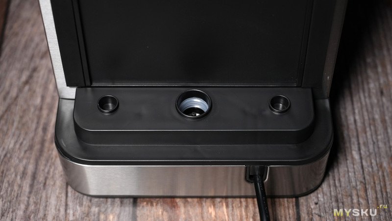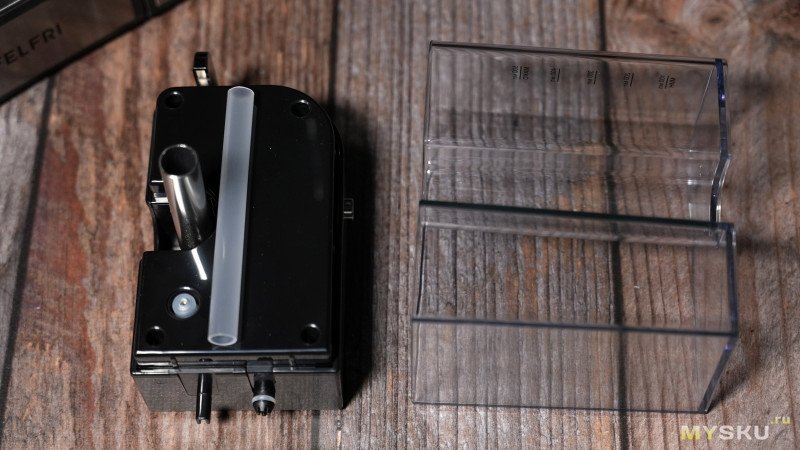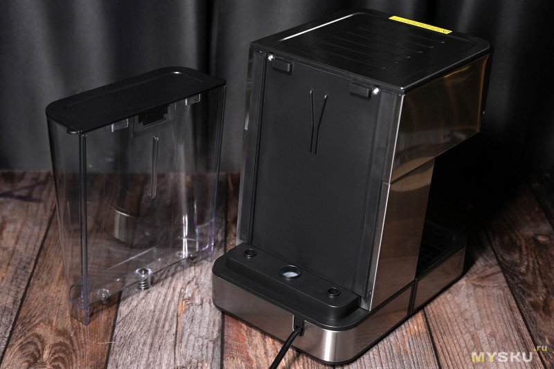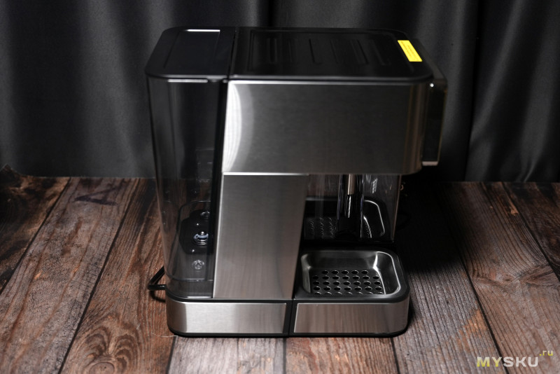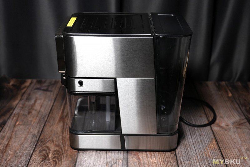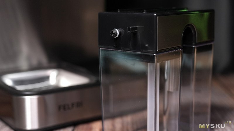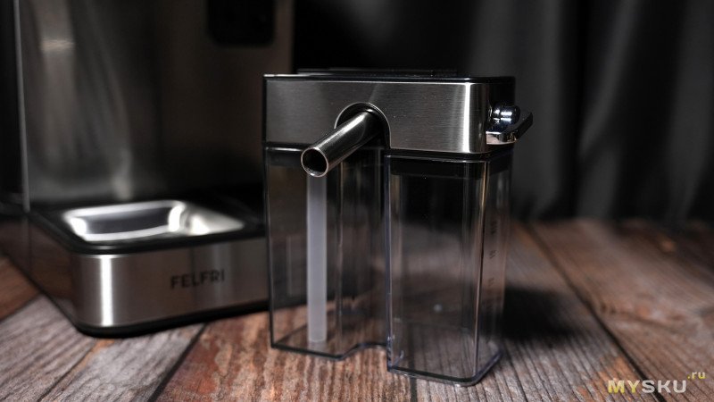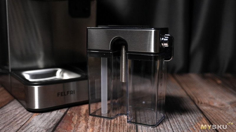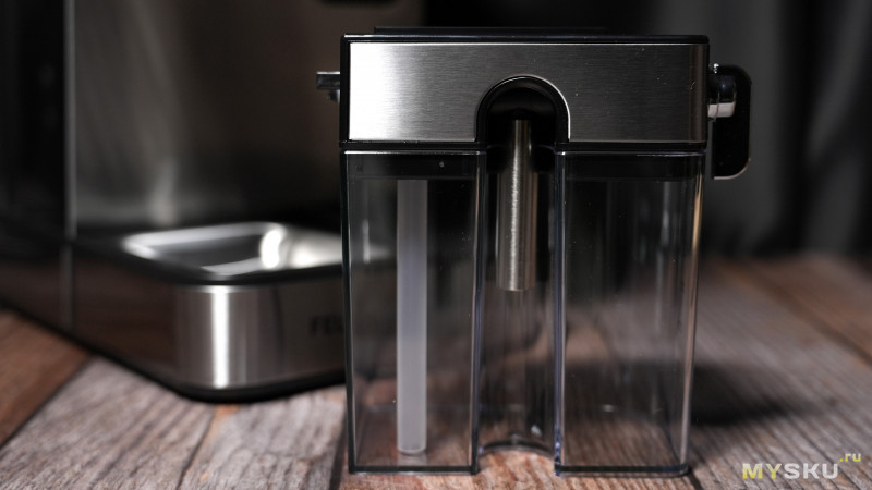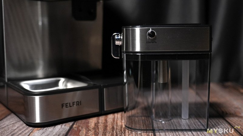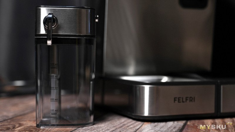 Правее установлен резервуар для молока ёмкостью 500мл, который чтобы извлечь, нужно нажать на кнопку с правой боковой стороны. Спереди нанесена мерная шкала.