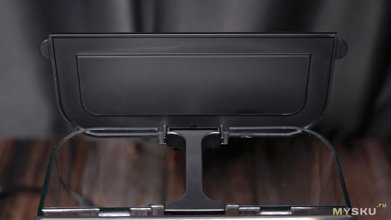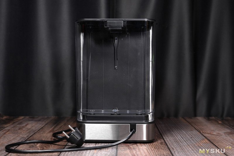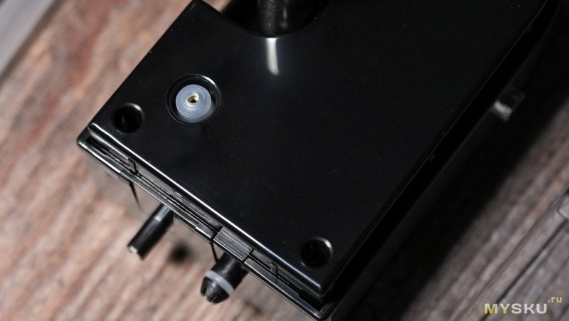 В задней части наверху находится откидная крышка основного резервуара для питьевой воды. Чтобы извлечь резервуар, нужно взяться и потянуть за эту среднюю стойку. Ёмкость 1.8л. Фильтрации нет. Есть мерная шкала.