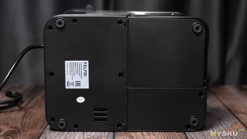 Опирается аппарат на четыре резиновые круглые ножки. На наклейке дана информация о потребляемой мощности 1500Вт