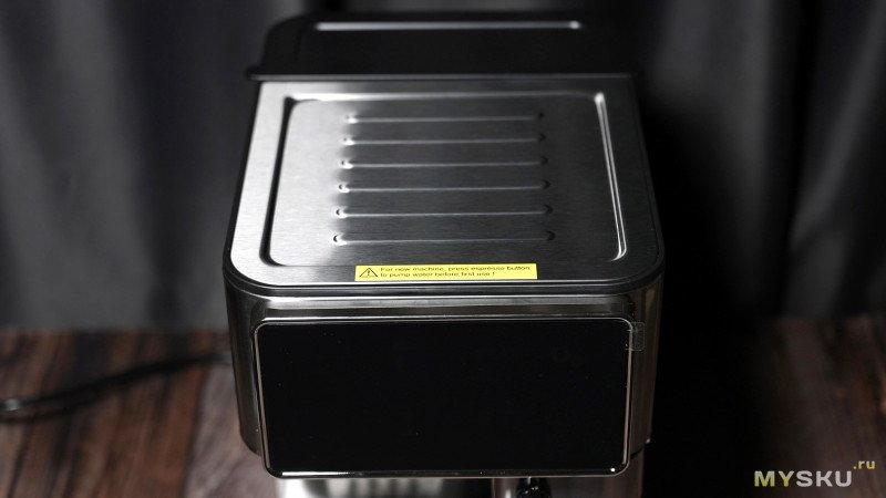 Наверху площадка для разогрева чашек. Предупредительная надпись на наклейке гласит: «Перед первым использованием новой кофемашины нажмите кнопку эспрессо, чтобы накачать воду!»