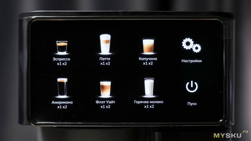 Через сенсорное меню можно запрограммировать свой пользовательский объём напитка для всех имеющихся режимов. Для этого сначала нажать на кнопку «Настройки», затем нажать на значок с нужным напитком — кофеварка начнёт пролив, визуально оцениваем нужный объём напитка по заполнению кружки и ещё раз нажать на значок с этим же напитком для завершения пролива. Программа сохраняется в память. Диапазоны объёма напитка ограничены пределами.