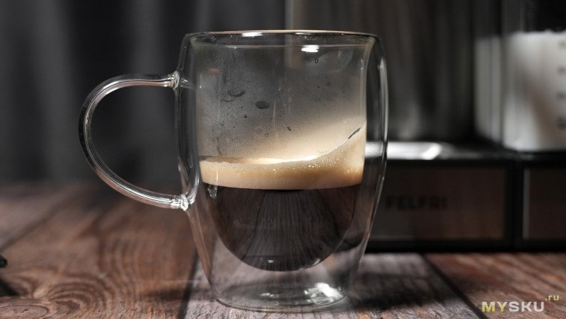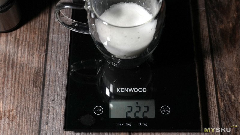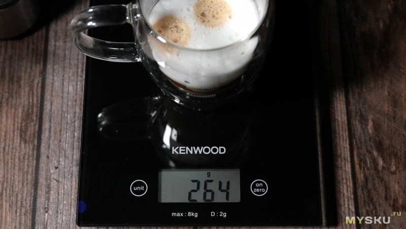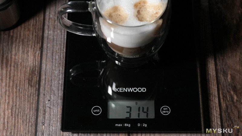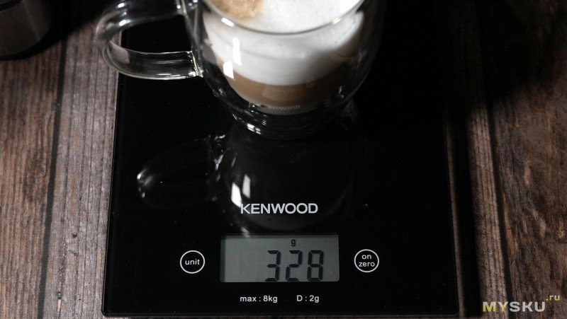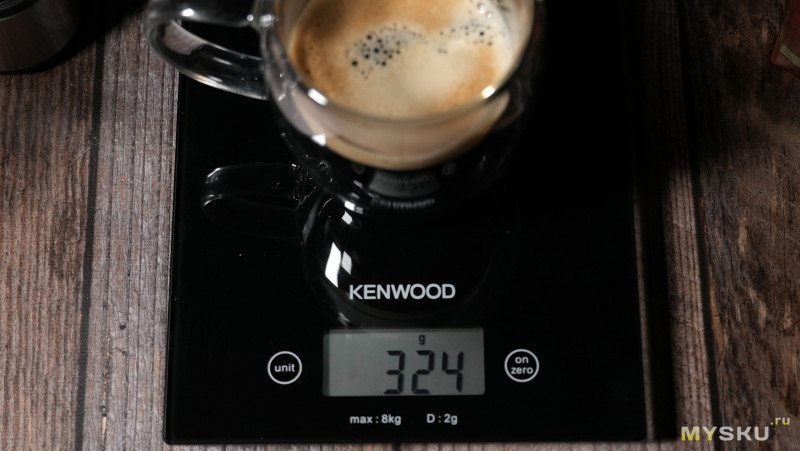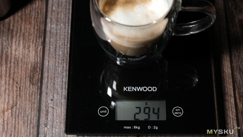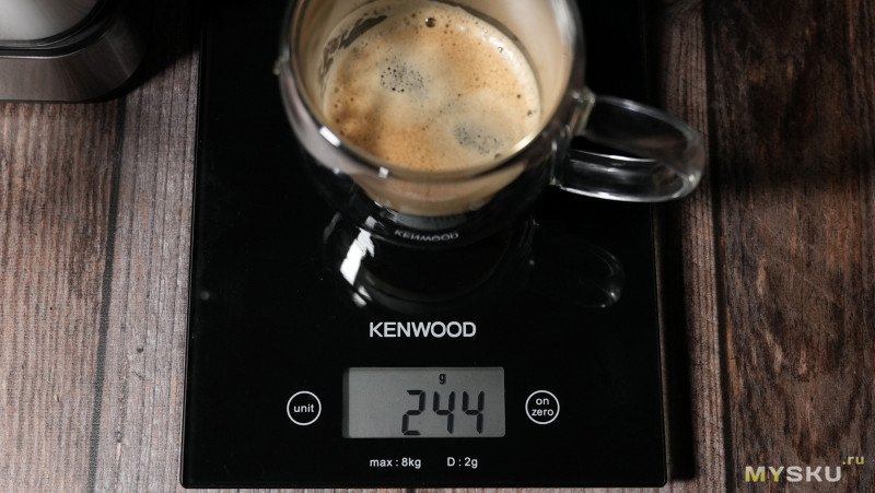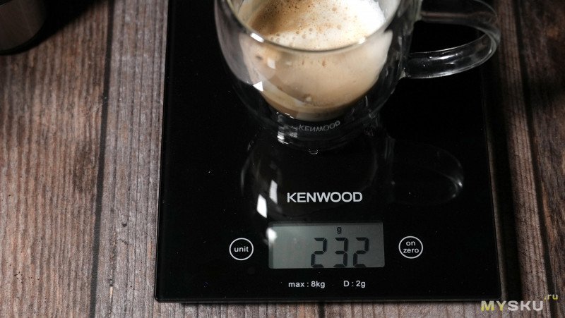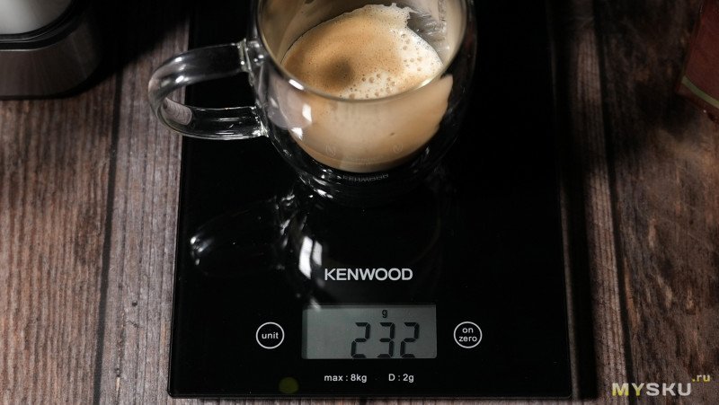 Вес напитка отличается от дефолтных значений из инструкции, 50гр одна порция и 94гр двойная — воды переливает, так как по канонам размер одного шота 25-35мл, а двойного 60мл. Вес пустого бокала 150гр, его вычитаем.