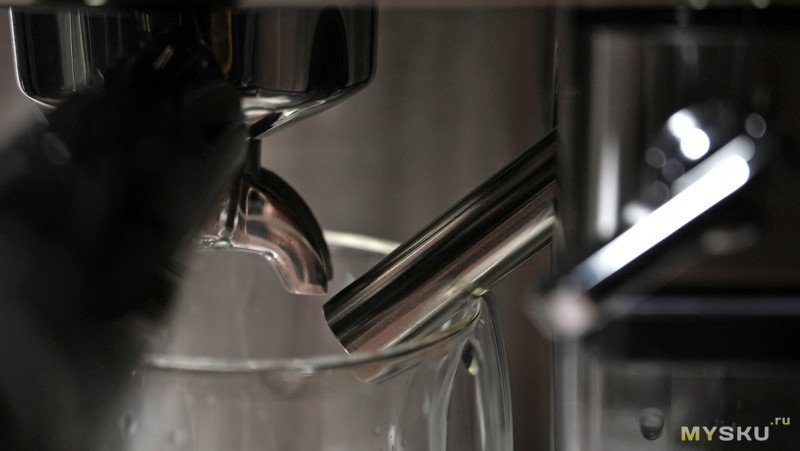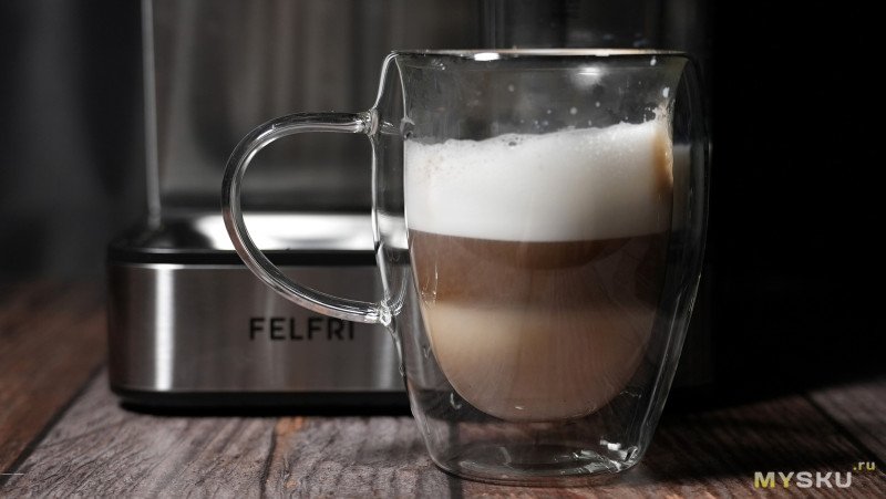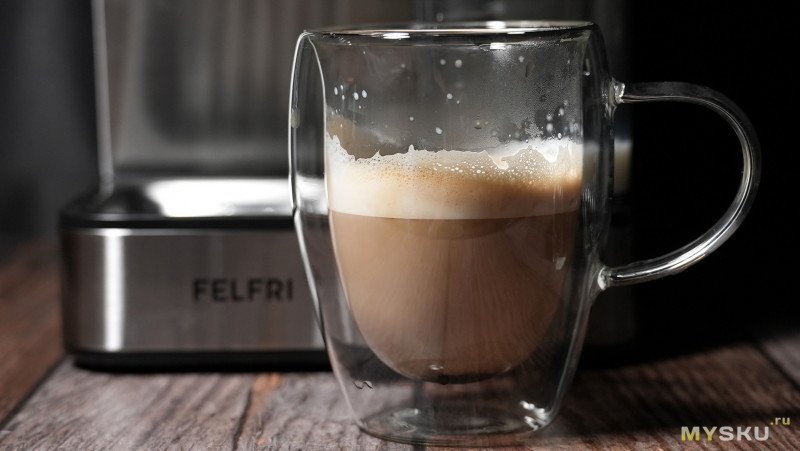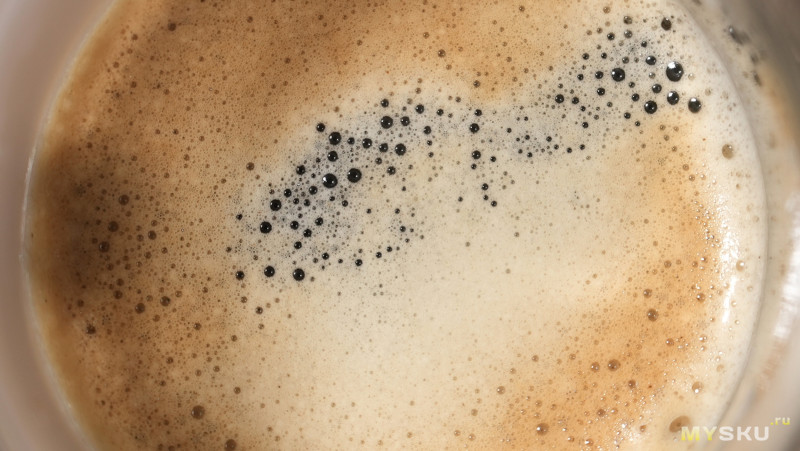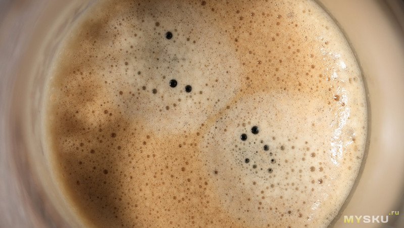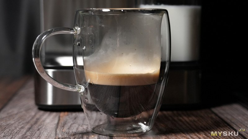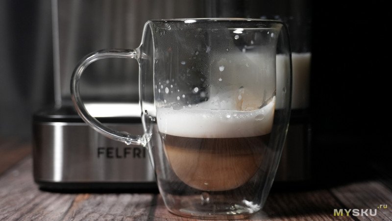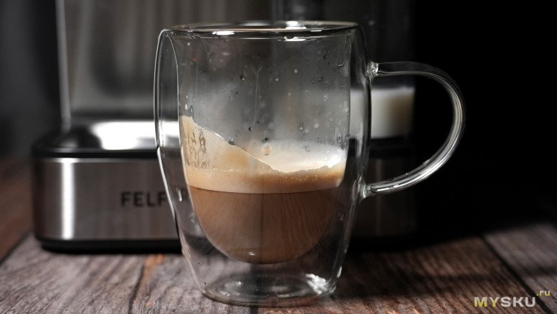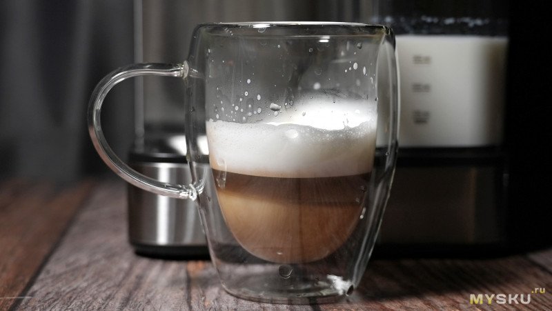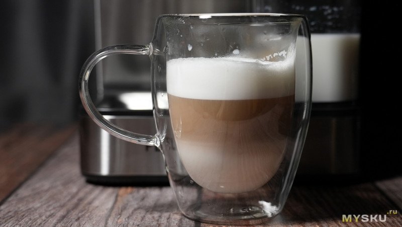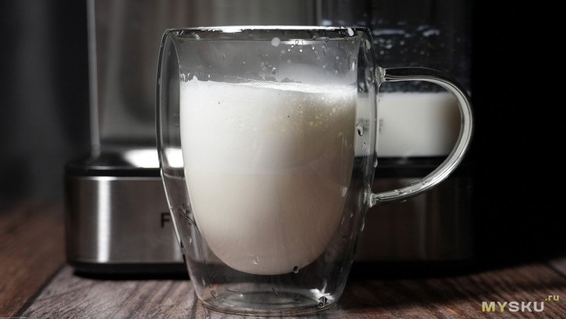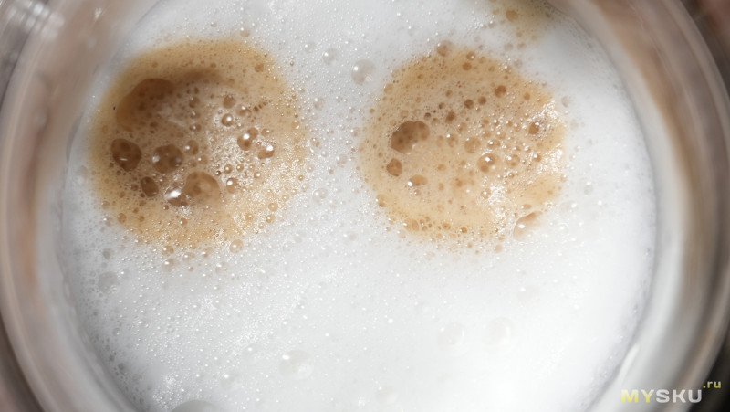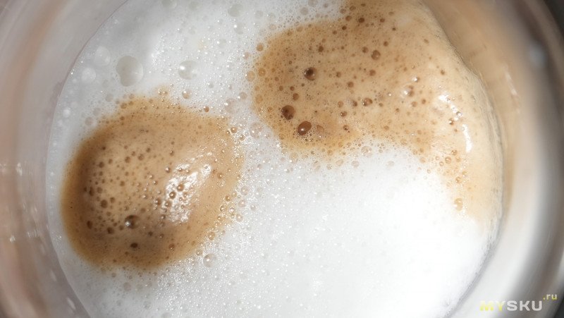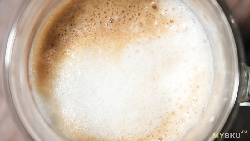 В первом случае носик сопла вывода молока я опустил недостаточно низко, хотя запас был, и от этого молоко разбрызгалось на стенку бокала и частично даже на стол, поэтому носик сопла нужно направлять максимально вниз, насколько позволяет стенка бокала.