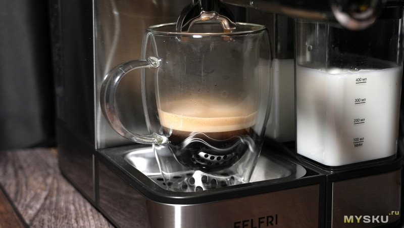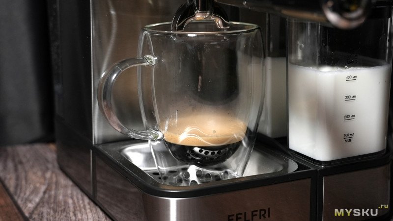 Посмотрим, как делает напитки с добавлением молока. Не забываем поднять сопло от правого резервуара с помощью крутилки.