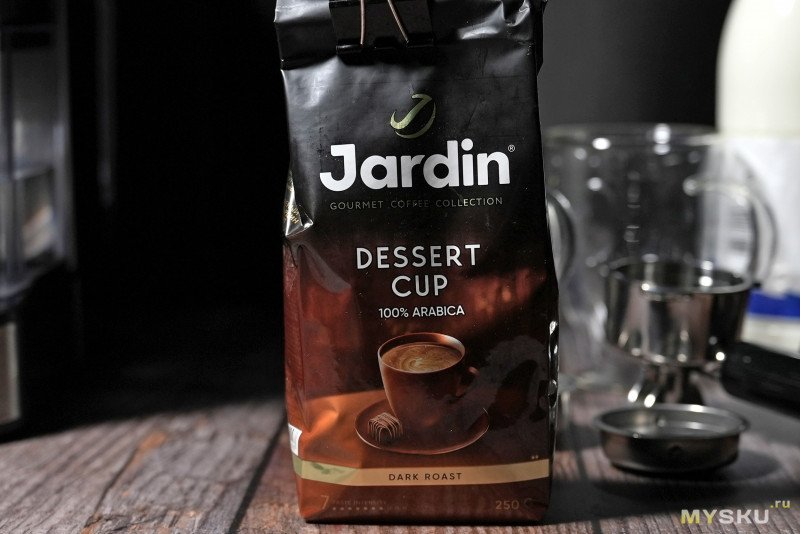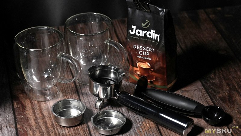 Подготовил молотый кофе (в наличии был Jardin Dessert Cup), рожок, фильтр и молоко (в инструкции советуют не более 2% жирности для плотной пены, но в местном магазине был только 2.5%). Для разлива специально для обзора купил прозрачные бокалы с двойными стенками, чтобы можно было просмотреть напиток в профиль. Высота бокалов 11.5см, чтобы поставить и убрать из-под рожка, уже требуется немного наклонять сосуд под некоторым углом.