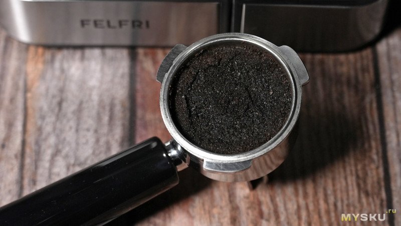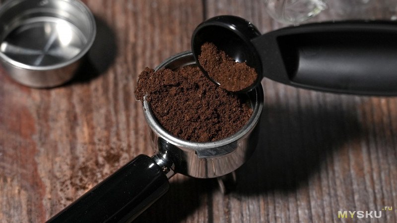 Черпаем комплектной ложкой кофе, насыпаем в предварительно установленную чашу на холдере, трамбуем в ровную таблетку, без фанатизма.