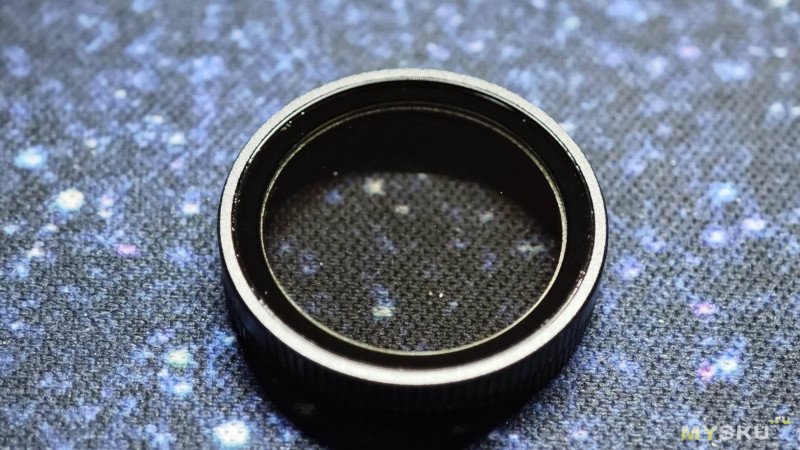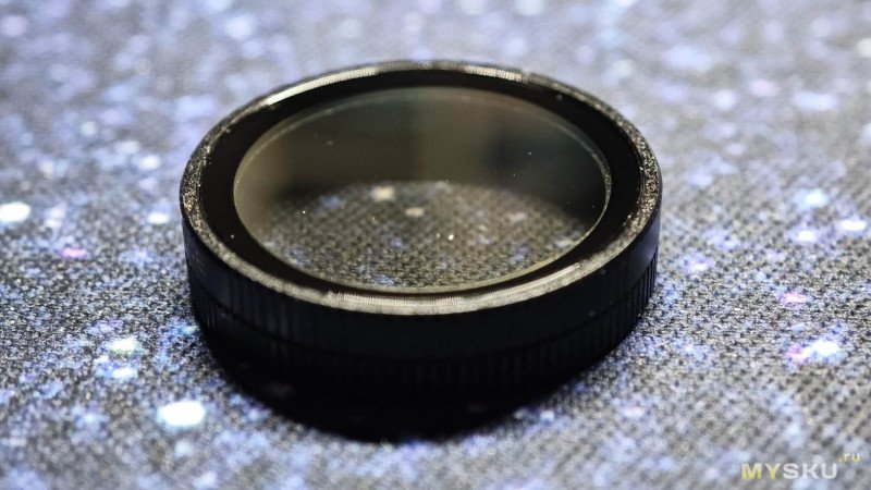 Фильтр представляет из себя пластиковую шайбочку с плоским поляризационным, слегка затемнённым стеклом.