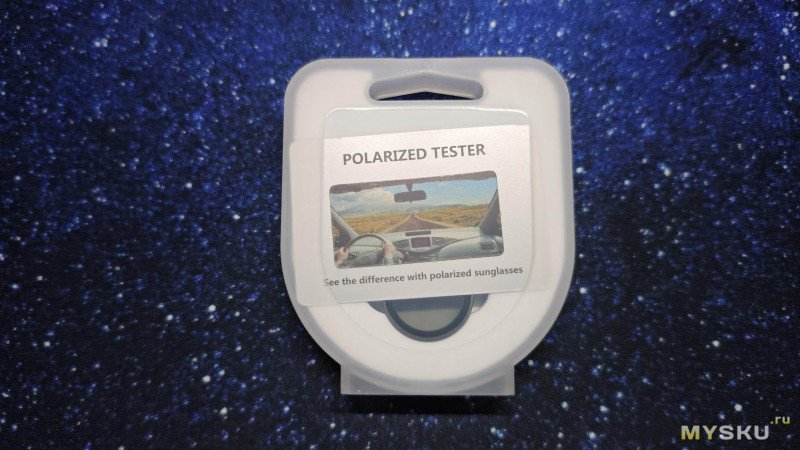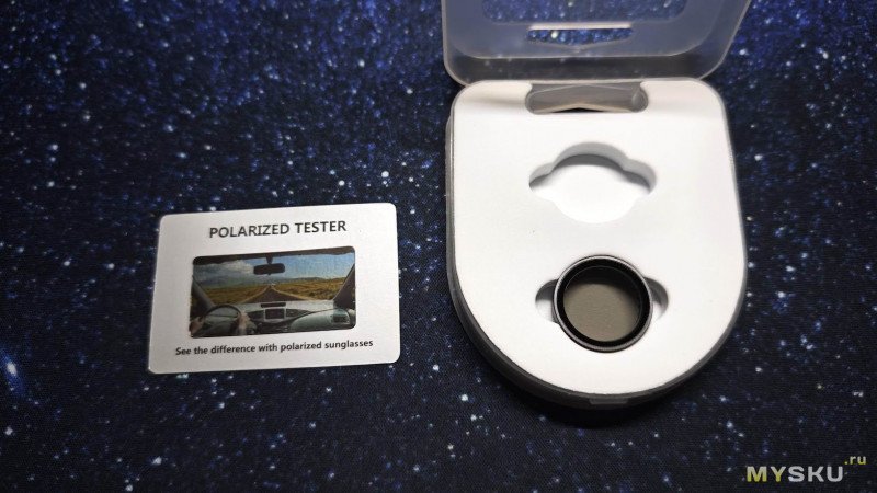 Внутри коробочки моё почтение — фирменный пластиковый футляр и специальная карточка для проверки поляризационных свойств фильтра.