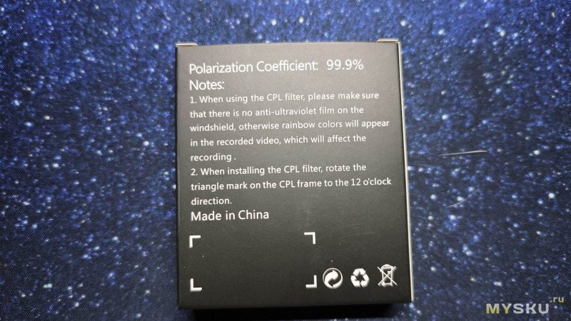 Поставляется CPL фильтр в небольшой коробочке из тонкого картона, на обратной стороне которой есть коротенькая инструкция по использованию на английском языке.