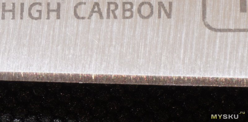 В описании этого лота, нам обещают сталь 1.4116. В большинстве же других источников пишут про 1.4110. Не знаю, тут в разных экземплярах дело, или где-то врут. Честно говоря, вообще не специалист по сталям. Вроде и та и другая неплохие. Пишут про три ступени закалки до 56-58 HRC, ещё и газ упоминают везде. Мне одно понятно (да и много где пишут), что это — довольно обычная сталь, которую и точить придется довольно регулярно и править мусатом ещё чаще.