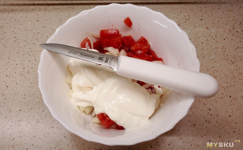 Лук порезал тоже, но это уже просто так, салат с помидорами люблю с луком ;)
