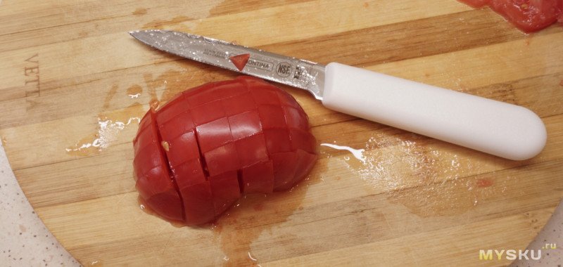 В обзоре ножа нельзя не вставить фото с отрезом помидорки. Я скептически отношусь к таким фото в обзорах, не знаю, что они доказывают, но раз полагается, то вот оно: