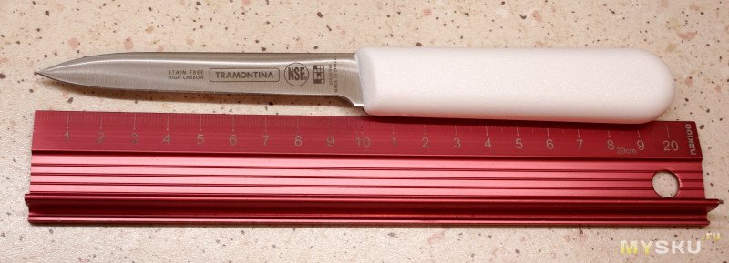 А ещё был очень давно купленный простенький овощной-фруктовый ножик с лезвием 12 см с деревянной ручкой. Как выяснил только сейчас, тоже Tramontina, но из серии Traditional. Жена хотела «такой же» но новый. Но в серии Professional, именно овощной только 8 см, а длиннее не находился, заказали короткий. И дальнейший опыт подтвердил, что такого короткого лезвия иногда маловато.