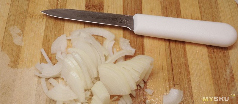 Начну, пожалуй с ответа на вопрос: а для чего же не хватает 8 см лезвия. Ответ простой — да, например, для крупной помидорки, или для красной луковицы. Не, порезать можно, конечно, и им. Но вот не очень удобно. А с обозреваемым удобнее намного. Казалось бы: всего-то 2 см. лезвия, а какая разница ;) В общем, он комфортнее. Чистить картошку, вырезать какие-то дефекты, «выкруживать», удобнее коротким, а в остальном — длинный удобнее.С точки зрения реза — тут всё как обычно. Довольно грубая заточка, довольно «резучий» из коробки: приблизительно на месяц постоянной эксплуатации хватает. Спелые помидорки тоненько порезать — да запросто. Через месяц, думаю уже надо будет править, вряд ли тут что-то будет отличаться от уже использующихся ножей этой серии.