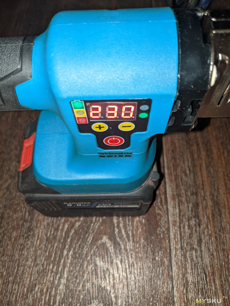 В отличие от другого, по отзывам менее мощного варианта (6-7 Ампер), устройство из обзора, во-первых, имеет 2 крепления насадок, во-вторых, можно вешать насадки намного большего, чем идущие в комплекте, диаметра, а в третьих, у него просто более удобный форм-фактор, как у сетевого. И даже есть продвинутая светомузыка на индикации! Потому я и взял его. Меньше компромиссов по сравнению с сетевым.