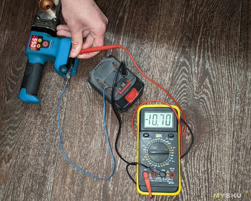 Подключаем к заранее купленной батарее и… Ничего не происходит. Потому что сначала прибор надо включить зажатием кнопки. Зажимать надо аж 3 секунды.