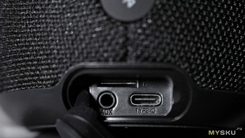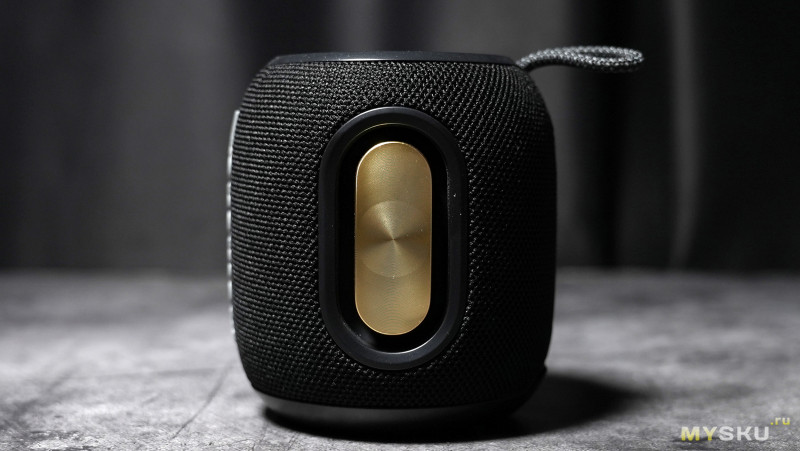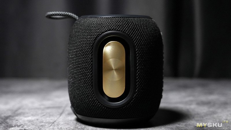 Музыкальный девайс выполнен в форме небольшого бочонка. Основная часть корпуса обтянута тканевой оболочкой. Широкополосный динамик всего один и он направлен вверх, при этом в описании модели указано, что звук распространяется на 360°, что конечно спорно. Рядом с краю находится несъёмный темляк-верёвка.