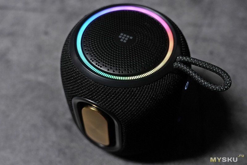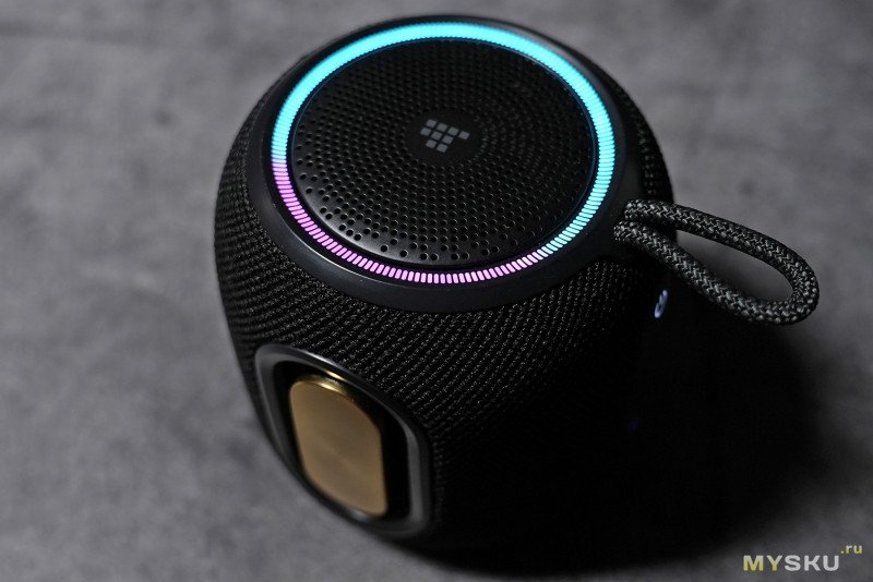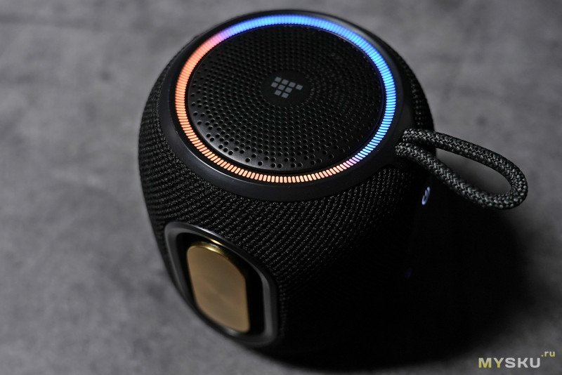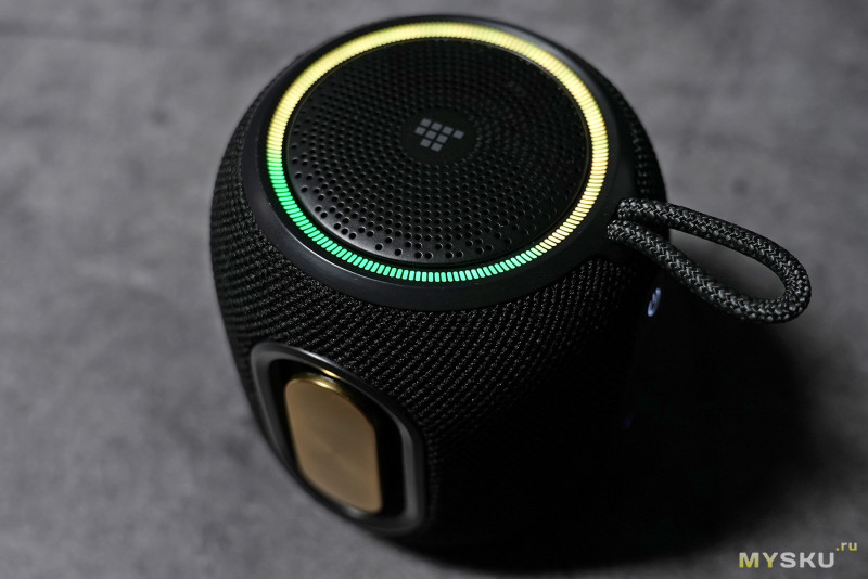 После запуска колонки вокруг широкополосного динамика включается RGB-подсветка, анимации которой можно настроить, либо вовсе выключить её через мобильное приложение.