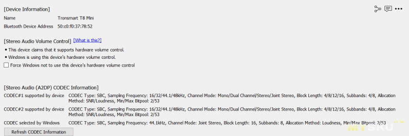 Доступно отображение уровня оставшегося заряда. Но нет выбора кодеков SBC/AAC.