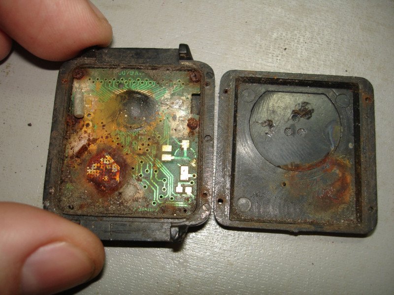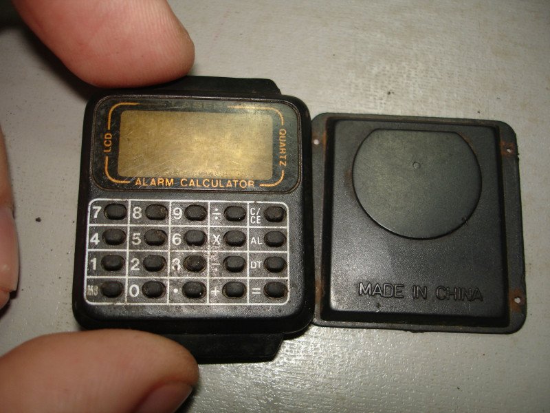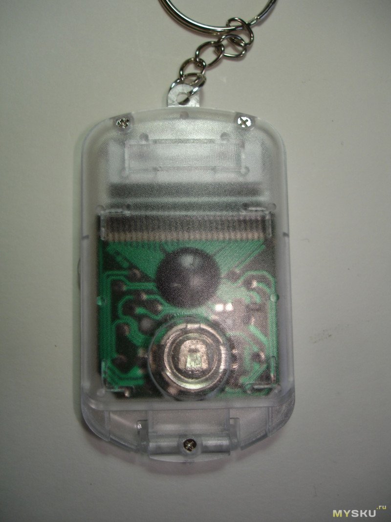 Сзади внутри просвечивает зелёная платка с залитой чёрным компаундом центральной микросхемой. Виден отсек для батарейки LR1130: