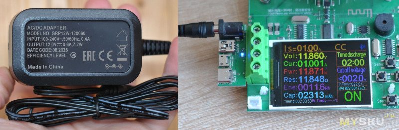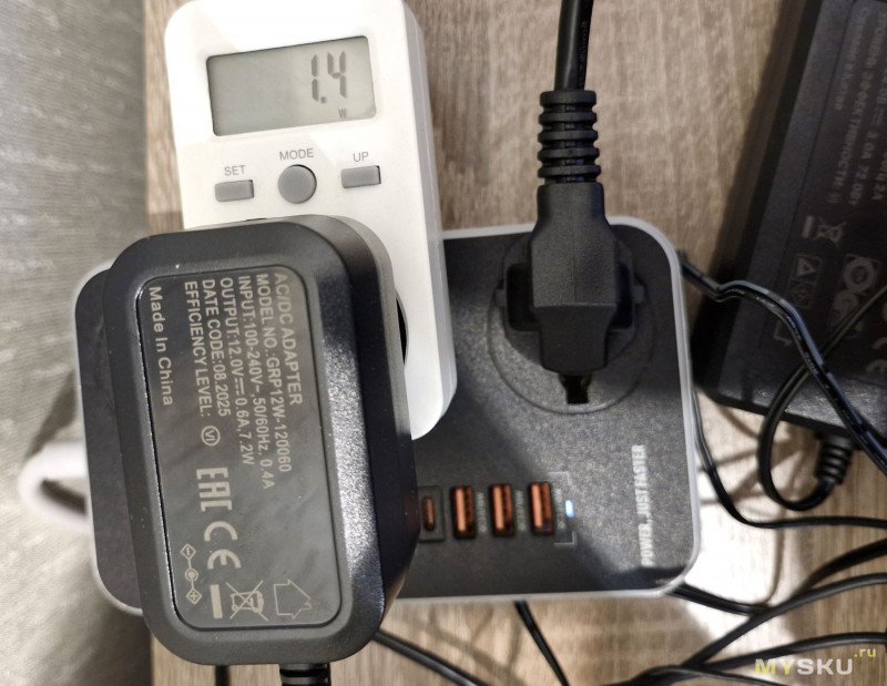 Теперь внешний сетевой блок питания.Модель GRP12W-120060, размеры корпуса 7,3х4,3х3,6 см, длина кабеля 1,5 м. Порт подключения 5,5х2,1 мм. Сразу и проверим его максимальынй ток на электронной нагрузке.