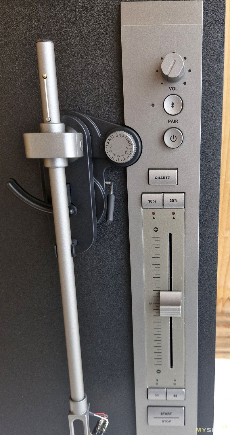 Для тонарма имеется микролифт и регулировка антискейтинга (компенсатор скатывающей силы иглы), причем удобно рукояткой без грузов на веревочке. А вот авто-стопа нет. Отдельная кнопка и регулировка громкости для Bluetooth подключения (вывод звука на беспроводные наушники или колонки). Pitch-контроль (регулировка скорости вращения) активируется кнопкой Quartz, доступна регулировка по двум диапазонам 10 и 20% от номинала. Сама регулировка осуществляется ползунком.