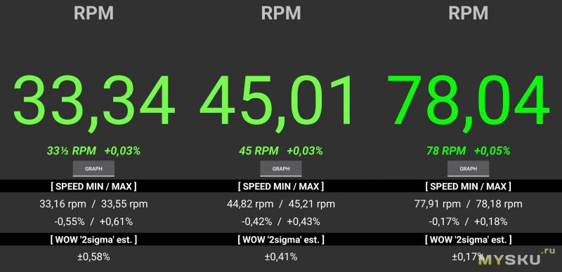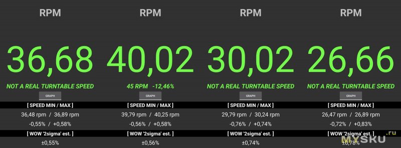 Ого-го точность, я таких результатов и не видел у моделей с пассиковым приводом.Пределы работы регулировки скорости (на двух основных скоростях):