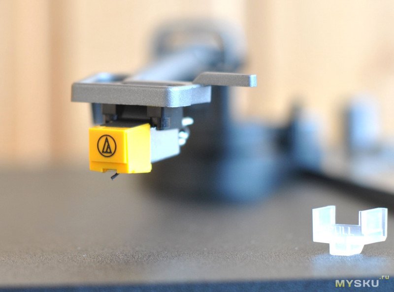 На конце тонарма сразу установлен картридж со звукоснимателем AT91 от Audio-Technica. Это бюджетное, но неплохое MM — решение с силой прижима конической иглы к пластинке около 2 г.