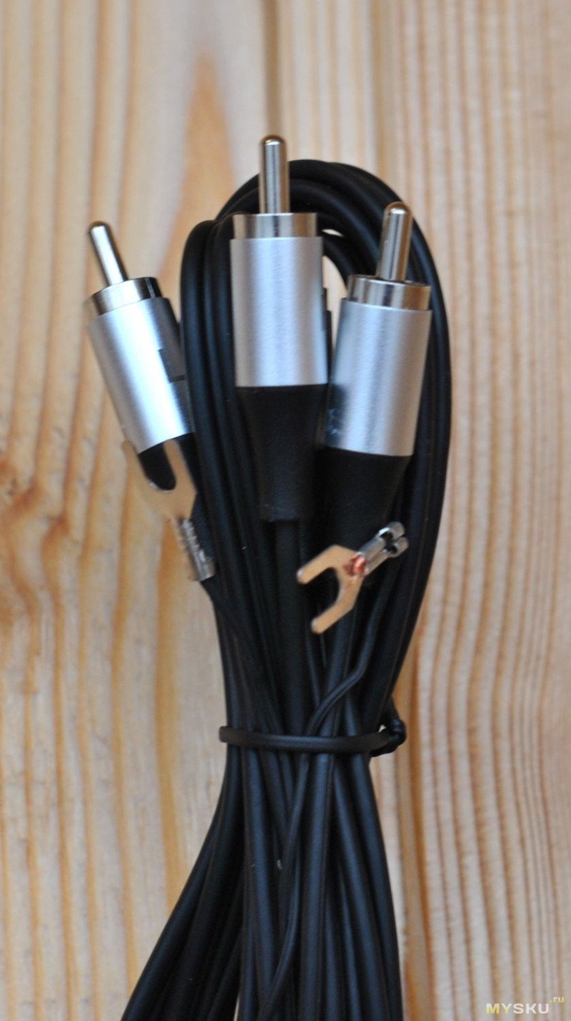 На кабеле (длина 1,5 м) помимо традиционных «тюльпанов» RCA есть еще жила от экрана для соединения земли компонентов, это нужно для правильной работы фонокорректора.