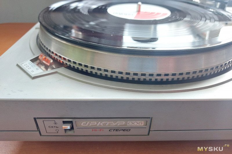 В этой связке можно поиграть с переключением фонокорректора (у колонок есть свой встроенный). Встроенный фонокорректор Reproductor мог бы быть более детальным.Первое, что хочу отметить — полная тишина при работе. Мотор прямого привода очень тихий. Остановка мгновенная. Диск тут без заметных осевых и торцевых биений, даже не видно как вращается.