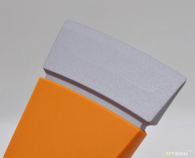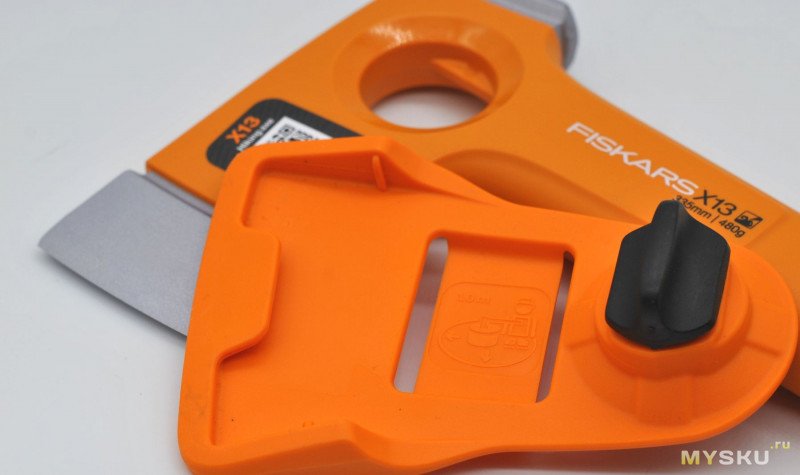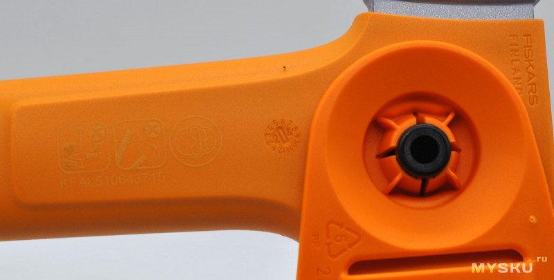 Ярко-оранжевый цвет рукоятки обеспечивает хорошую видимость в лесу. Видна прорезь для крепления на поясном ремне.Ручка: