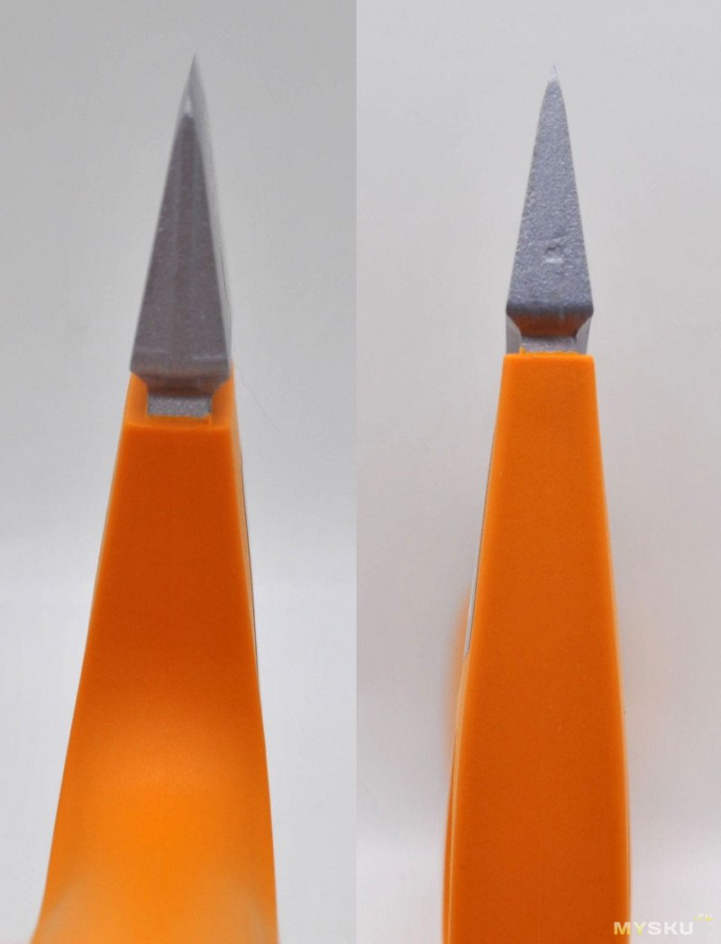 Сталь магнитится. Максимальная толщина 9 мм. Нанесено антифрикционное и защитное покрытие. Бруском подправил РК — стал резать бумагу.Форма лезвия: