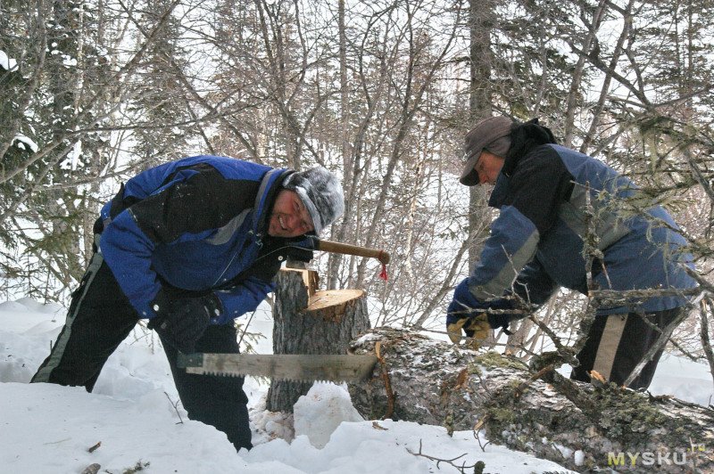 В итоге в походы носим старый двуручный топор (с очень длинным топорищем, но всего лишь 700 гр полотном) — не сильно тяжелее, но за счёт замаха позволяет разрубать поперёк валежник в случае необходимости. Чаще конечно цепной пилим.
