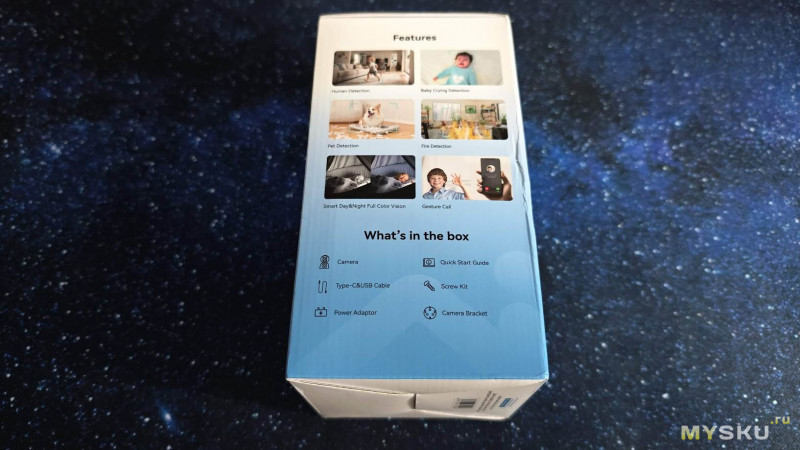 Поставляется камера в иллюстрированной картонной коробке, с наглядным описанием основных функциональных возможностей гаджета.