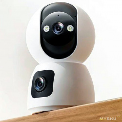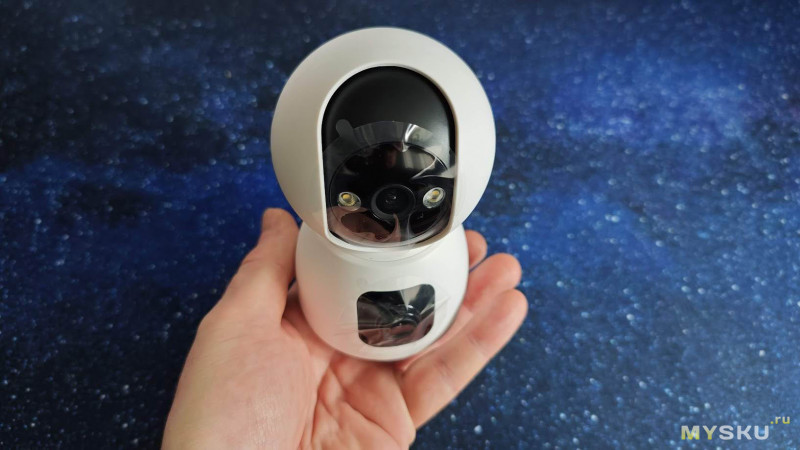Эту камеру отличает наличие сразу двух полноценных 2 МП объективов, ведущих одновременную независимую 2-х канальную съёмку. Это позволяет одномоментно наблюдать за двумя разными зонами. Один объектив имеет фиксированное положение, а второй оснащён поворотным механизмом (PTZ). Если поставить такую камеру к окну, то её можно использовать например, как охранную для автомобиля, стоящего во дворе и в то же время, как контрольную для присмотра за детьми или домашними животными в доме.